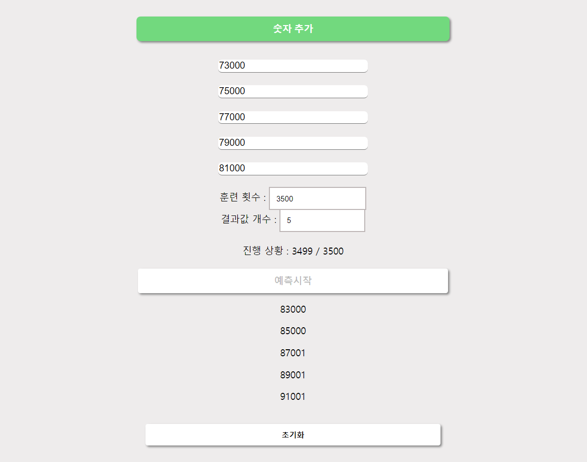 가운데 입력칸에 숫자들을 입력하고 훈련횟수와 결과값 개수를 입력한 다음 예측시작을 누르면 훈련이 시작된다.